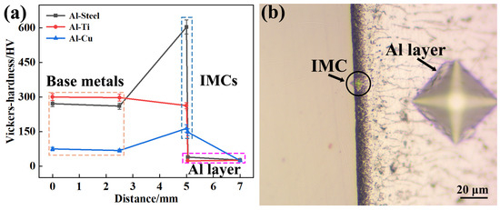 The results of the microhardness test for the joints are presented in Figure 9. The hardness values of IMCs were the highest, followed by the base metals, while the aluminum layer showed the lowest hardness. Among the IMCs, the Fe4Al13 displayed the maximum hardness of 604.4 HV, followed by the TiAl3 with a hardness of 262.7 HV. The Al2Cu and Al3Cu4 revealed the lowest hardness values of 147.9 HV and 163.8 HV, respectively. The measured hardness values of Fe4Al13 and TiAl3 were lower than their theoretical values [37,38], which may be attributed to the compound thickness being slightly smaller than the indenter width. The hardness values of the Al/Cu joint showed good agreement with those reported by Kaya et al. for explosively welded joints [39].