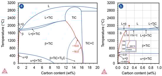 The phase diagram presented in Figure 2a highlights several key features, including the dominant presence of the β phase and the non-stoichiometric titanium carbide TiC in the alloy microstructure, as well as the limited solubility of carbon in both β and α phases, which decreases significantly with decreasing temperature (red lines). Also notable is the wide concentration range between 12.4 and 16.5 wt% carbon, in which stoichiometric TiC is stable in the microstructure, alongside a distinct field for the occurrence of the non-stoichiometric titanium carbide Ti₂C. In addition, the minimum carbon content required to form stoichiometric TiC also decreases significantly with decreasing temperature, as illustrated by the red curve in Figure 2a.