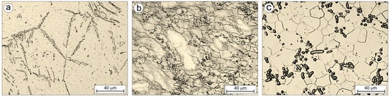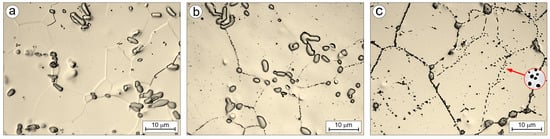 Figure 3 presents the microstructures of the Ti-33Mo-0.2C alloy after casting (Figure 3a), hot rolling (Figure 3b), and annealing (Figure 3c). The microstructure observed in Figure 3a results from a sequence of phase transformations occurring during solidification and subsequent cooling: L → L + β → L + β + TiC → β + TiC → α + β + TiC (see Figure 2b). After casting into a metallic mold, the structure consists almost exclusively of large, elongated, and irregularly shaped primary carbides located at the grain boundaries of the coarse-grained matrix (Table 3), formed as a result of the eutectic reaction. Additionally, fine secondary carbides are also present, precipitated due to the changes in carbon solubility within the matrix (Figure 2b).
