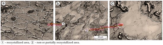 The inhomogeneity accompanying grain refinement (Figure 3b, Table 3) is reflected in the microstructural non-uniformity of the deformed alloy (Figure 3b and Figure 4b), manifested in the presence of both fully recrystallized areas (Figure 4a) and non-recrystallized or partially recrystallized regions (Figure 4c). This condition is attributed to the fragmented carbides, which influence the course of microstructural reconstruction processes in the hot-rolled alloy. It has been observed that new, recrystallized grains are predominantly located in regions where carbides are present. In areas lacking carbides, signs of recrystallization are absent or only partial. This phenomenon frequently occurs in deformed alloys containing hard second-phase precipitates. However, in titanium alloys, it is considered extremely rare and has thus far been confirmed only in certain compositions belonging to the burn resistant group of titanium alloys [48].