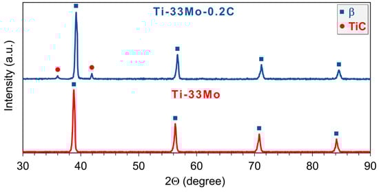 The lattice parameter of the β phase present in the structure of the Ti-33Mo alloy, determined by XRD, is 0.3230 nm (Table 4), which is significantly lower than the lattice parameter of β-Ti, reported as 0.3310 nm [64]. In contrast, the presence of carbon in the Ti-33Mo-0.2C alloy, acting as an interstitial element, leads to an increase in the β phase lattice parameter to 0.3236 nm compared to the carbon-free alloy (Table 4).