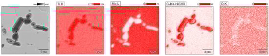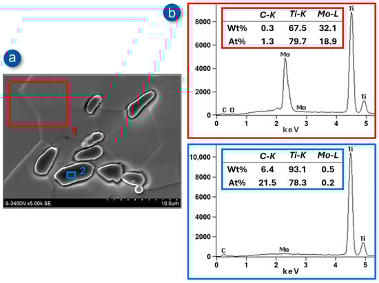 A point quantitative analysis of the chemical composition in the areas marked in Figure 8a—corresponding, respectively, to the matrix (point 1) and the carbide (point 2) of the Ti-33Mo-0.2C alloy after annealing—confirmed the intended chemical composition of the alloy as well as the non-stoichiometric content of titanium and carbon in the carbide, amounting to 78.3 at% and 21.5 at%, respectively (Figure 8b). Consequently, the carbide initially identified by XRD as titanium carbide TiC (see Figure 5) should be denoted as TiCx, a designation applied to non-stoichiometric carbides present in titanium–carbon alloys.