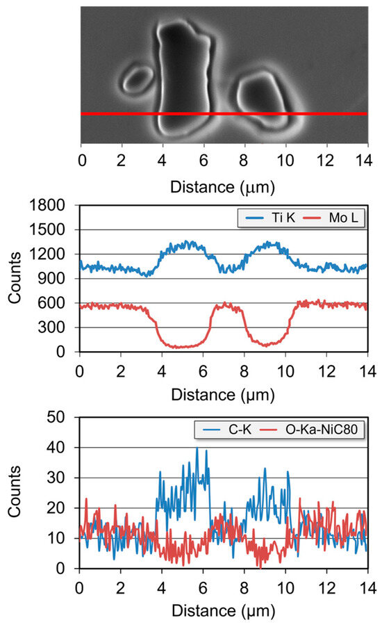 The elemental mapping analysis shown in Figure 6, obtained via EDS/WDS acquisition, illustrates the spatial distribution of the elements: titanium, molybdenum, carbon, and oxygen within the investigated alloy. These maps confirm a significantly higher carbon content and a slightly increased titanium content in the carbides located at grain boundaries and within the grains of the Ti-33Mo-0.2C alloy matrix, compared to the surrounding matrix. At the same time, the maps reveal that these carbides are markedly depleted in molybdenum and exhibit a lower oxygen content relative to the matrix, as further confirmed by the linear elemental distribution analysis presented in Figure 7. The presence of oxygen in the carbides and its reduced content at the matrix/carbide interface, relative to the β phase matrix (Figure 7), supports the purifying effect of carbides, which “trap” oxygen from the matrix—a phenomenon also reported in other studies [42,43] on Ti-V-Cr-type alloys with a stable β-phase structure.