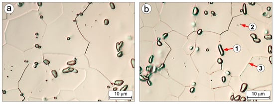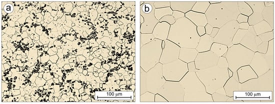 Figure 9 presents the microstructure of the carbon-containing Ti-33Mo-0.2C alloy (Figure 9a) and the reference carbon-free Ti-33Mo alloy (Figure 9b), both annealed under identical conditions: 850 °C for 1 h followed by air cooling. The initial microstructures shown in Figure 9 were compared in terms of properties relevant to their current and potential applications. It should be noted that the compared alloys were produced and processed under identical conditions, and the nearly nine-fold difference in the initial average grain diameter (10.3 ± 5.3 μm in Ti-33Mo-0.2C vs. 90.3 ± 32.0 μm in Ti-33Mo) is solely the result of the beneficial effect of carbon and carbides present at grain boundaries on the final grain size after completing all necessary technological treatments.