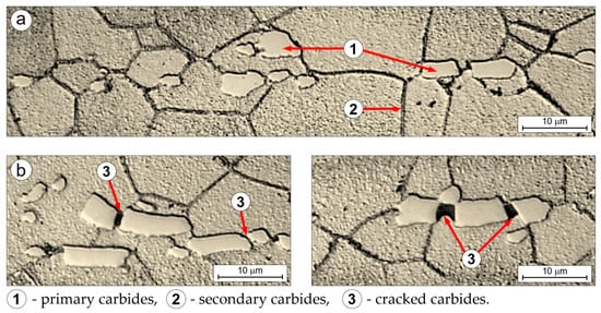 The microstructural examination of longitudinal sections of both the undeformed grip and the deformed gauge portions of samples after creep testing confirmed the critical role of large, irregular primary carbide precipitates tightly associated with grain boundaries, along with numerous fine secondary carbides decorating these boundaries (Figure 11a). These carbides, located at grain boundaries—regions critical to the creep process—impede grain boundary sliding and thus slow overall creep deformation. This is supported by the visible signs of cracking and fragmentation of the primary carbides observed in the deformed region of the specimen after creep (Figure 11b), which are absent in the undeformed grip section (Figure 11a).