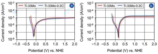 Effect of carbon on the potentiodynamic polarization curves of the Ti-33Mo alloy in 10% hydrochloric acid solution (a) and 40% nitric acid solution (b).