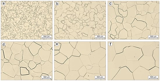 The rapid grain growth at elevated temperatures results from the increased diffusion of alloying elements within the β phase, which predominates in the microstructure of molybdenum-rich Ti-Mo alloys. This phenomenon is primarily attributed to the crystalline lattice structure of this body-centered cubic (BCC) phase [17,30,33].