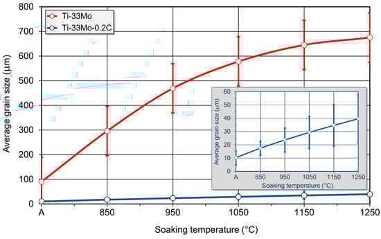 The presence of carbides—even partially dissolved but strongly bonded to the grain boundaries—effectively inhibits grain growth, particularly under conditions that would otherwise promote its acceleration. Consequently, the extent of grain growth in the Ti-33Mo-0.2C alloy is significantly smaller compared to the carbon-free alloy (see Figure 16).
