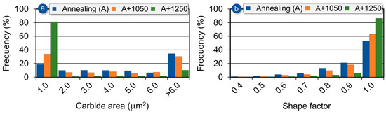 Effect of soaking temperature on the carbide area (a) and shape factor distribution of the carbides (b) in Ti-33Mo-0.2C alloy.