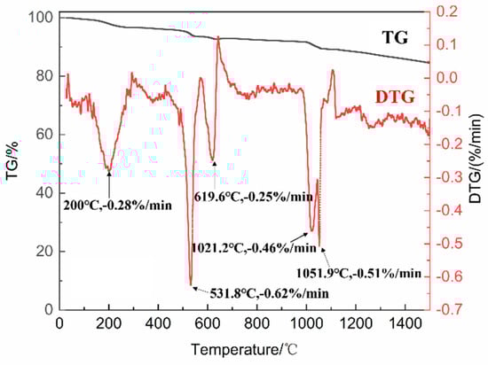 In this study, CuCoMnOx powders were synthesized using a solid-phase reaction method. To elucidate the synthesis mechanism as well as the final sintering temperature of the CuCoMnOx powders, we analyzed the TG-DTG results obtained from the granulated mixture of CuO-Co3O4-MnO2, as illustrated in Figure 1. It can be observed from Figure 1 that the granulated powder of CuO-Co3O4-MnO2 experiences mass loss at temperatures of approximately 200 °C, 531.8 °C, 619.6 °C, 1021.2 °C, and 1051.9 °C. The maximum mass loss rates corresponding to these temperature points are as follows: 0.28%/min for 200 °C, 0.62%/min for 531.8 °C, 0.25%/min for 619.6 °C, 0.46%/min for 1021.2 °C, and 0.51%/min for 1051.9 °C. It has been reported in the literature that the decomposition of MnO2 into Mn2O3 occurs at temperatures of 520 °C [31], 550 °C [32], and 596.1 °C [33]. Consequently, the weight loss observed around 531.8 °C in Figure 1 can be interpreted as the decomposition of MnO2. Based on the laboratory experience, the weight loss observed near 200 °C and 619.6 °C in Figure 1 is believed to correspond to the combustion of the binder, dispersant, and defoamer incorporated into the mixed powders of CuO-Co3O4-MnO2 during the granulation process. The primary reaction equations are presented as follows:
