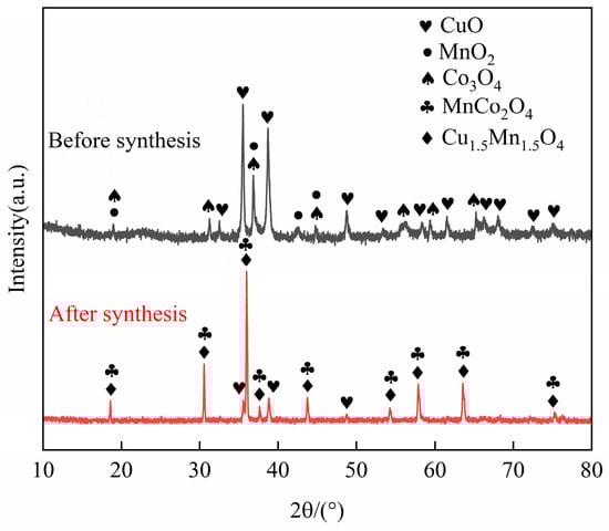 CuO powders (with purity of 99.5%), MnO2 powders (with purity of 99.5%), and Co3O4 powders (with purity of 99.9%) were sourced from Qinhuangdao Yinuo High-tech Materials Development Co., Ltd., Qinhuangdao, China. The corresponding masses of these powders were measured according to the molar ratio of Cu:Mn:Co, set at 3:3:1. Deionized water was added to the three mixed powders at a solid–liquid mass ratio of 1:0.84. Additionally, a self-prepared binder, dispersant, and several drops of defoamer (tributyl phosphate) were incorporated into the mixture. Subsequently, the mixture was introduced into a colloid mill and subjected to high-speed mixing for a duration of 2 h to ensure a homogeneous slurry. After that, the slurry was pumped into the centrifugal atomization tower to form spherical particles. The parameters for the granulation process are as follows: the air outlet temperature was set at 110 °C, while the air inlet temperature was maintained at 240 °C. The rotational speed of the atomizing disc was established at 18,000 r/min, and the feeding rate was specified as 45 mL/min. The obtained powder was sintered in a muffle furnace with a heating rate of 5 °C/min. The sinter temperature was maintained at 600 °C for 1 h to remove the binder, and at 1100 °C for 2 h to promote solid reaction. Subsequently, the material was allowed to cool within the furnace, resulting in the formation of CuCoMnOx powder.