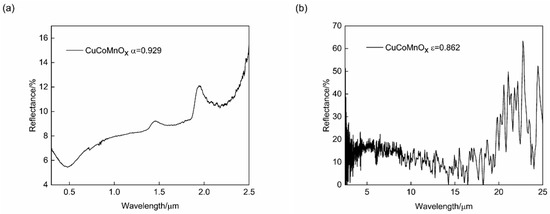 The CuCoMnOx powder serves as a fundamental raw material for the spraying coatings, and its inherent optical performance significantly impacts the final absorptance and emittance of these coatings. To investigate the optical performance of prepared CuCoMnOx powder, the reflectance spectra were measured in the wavelength ranges of 0.3–2.5 μm and 2.5–25 μm, and is presented in Figure 3. Based on results, the absorptance of the CuCoMnOx powder was 0.929, while the emittance was 0.862, giving a quality factor of α/ε equaling to 1.078. Herein, it is observed that CuCoMnOx exhibits a high absorptance, while it also has a high emittance. In other words, achieving an ideal quality factor remains impossible for single CuCoMnOx-based ceramic coating. Composite with low-absorption and low-emission metal Co to form a metal–ceramic coating might be an effective way to obtain good solar selective absorption performance. Thus, this paper attempted to optimize the composition of the Co-CuCoMnOx composite coatings, in order to obtain a higher quality factor of solar selective absorption performance.