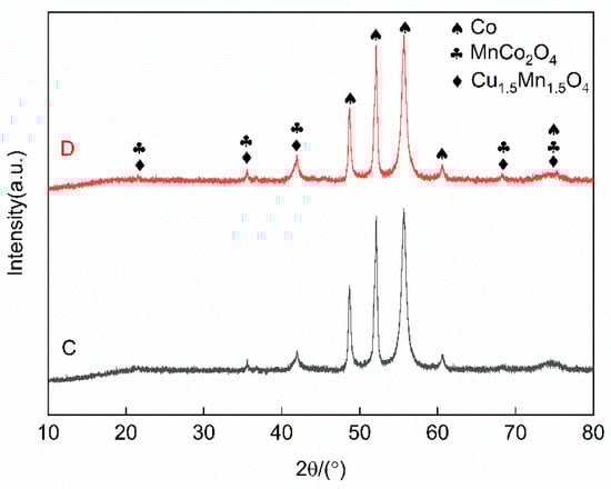 To identify the phase composition of the four-groups Co-CuCoMnOx powders, Group C (10% CuCoMnOx) and D (15% CuCoMnOx) were subjected to X-ray diffraction (XRD) analysis. The results are presented in Figure 5. Both groups of powders mainly contain three phases—Co, Cu1.5Mn1.5O4, and MnCo2O4—indicating that no chemical reactions occurred within the composite powders during the processes of granulation and degumming, and confirming that the phase composition aligned with the initial design specifications.