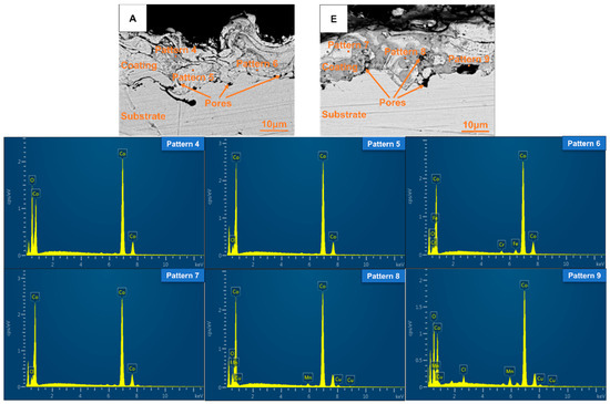 To investigate the chemical composition differences among coatings containing CoCuMnOx and those without, the corresponding EDS point analysis of the coatings of Groups A and E was selected. The results are summarized in Table 4 and Figure 8. In the backscattering images, the brighter the phase, the larger the corresponding atomic number. Based on the results of Patterns 5 and 6, it could be inferred that the grayish-white regions within the coating of Group A mainly consisted of cobalt (Co) along with a minor presence of cobalt oxide (CoO). In addition, A small amount of matrix elements Fe and Cr are diffused in the part of Group A coating near the substrate, and there are pores inside the coating. In contrast, according to Pattern 4, the gray areas in the coating resulted from a more extensive oxidation of Co. In conjunction with the XRD results, it was inferred that the grayish-white regions marked by Pattern 7 within the coating of Group E consist of Co and a small amount of CoO. The grayish-black areas were identified as containing Co, CoCuMnOx, and CoO, while the black regions not only exhibited porosity but also comprised a mixture of Co, CoCuMnOx, and CoO. In addition, the presence of Cl in Group E coating might be due to a very small amount of Cl impurity in the granulation tower, which was mixed into the spherical spray powder during the spray granulation process, resulting in the inclusion of the Cl element in the coating.