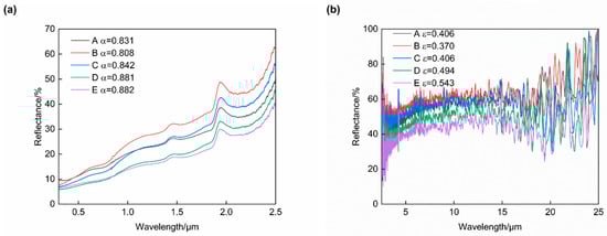 Reflectance spectra of Co-CuCoMnOx coatings in the ranges of (a) 0.3–2.5 μm and (b) 2.5–25 μm. Group A: 100Co coating, Group B: 95Co-5CuCoMnOx coating, Group C: 90Co-10CuCoMnOx coating, Group D: 85Co-15CuCoMnOx coating, Group E: 80Co-20CuCoMnOx coating.