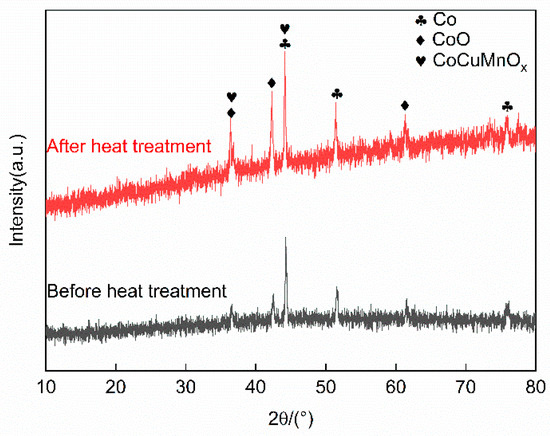 To evaluate the high temperature stability of the Co-CuCoMnOx coatings, the coatings of Group B underwent a high-temperature heat treatment at 450 °C in an atmospheric environment for a duration of 3 h. The optical performance prior to and after the high-temperature heat treatment are presented in Table 6. Additionally, the X-ray diffraction (XRD) patterns of the coatings before and after the heat treatment are illustrated in Figure 10. Based on the variations in diffraction peak intensity before and after the heat treatment, it could be inferred that the content of CoO increased after the heat treatment. Consequently, the solar absorptance and infrared emittance of the coating increased after the heat treatment. The performance criterion (PC) to evaluate the high temperature stability of the coating is if the PC value described as Equation (5) [36] is below 0.05, it can be concluded that the degradation performance of the coating at elevated temperatures is not significant. Furthermore, this suggests that the coating exhibits relatively good thermal stability under such conditions [37]. After the heat treatment, it was found that no cracking or shedding happened on the coating surface. The solar absorptance of the coating reached 0.89, while its emissivity increased by 0.168 compared to pre-treatment values. The PC value of the coating after the heat treatment at 450 °C for 3 h in an atmospheric environment was calculated as 0.002, which was far below the threshold of 0.05. The attenuation of the optical performance of the coating was negligible. Therefore, it could be concluded that the coating exhibited excellent thermal stability when maintained at 450 °C in an atmospheric environment for a duration of 3 h.