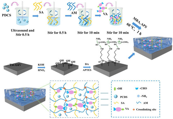 The oil on the surface of Ti6Al4V was cleaned by ultrasonic cleaning in acetone solution for 1 h, washed with distilled water three times and then cleaned by ultrasonic cleaning in distilled water for 1 h. Then, the titanium alloy plate was immersed in 5 mol/L KOH solution and stirred for 24 h so that the surface of the titanium alloy was completely grafted with hydroxyl. Then the hydrogenated titanium alloy plate was soaked in 0.3 wt.% APTES solution for 1 h, and the pH was adjusted to 8.5 with hydrochloric acid. Subsequently, a dopamine (DA) solution with a concentration of 0.2 wt.% was configured, the pH was adjusted again to 8.5 using tri-methylate aminomethane and the plates were placed in the dopamine solution and stirred for approximately 24 h. The amino group on the dopamine grafted on the substrate formed a number of hydrogen bonds with the core–shell polymer nanoparticles to enhance the bonding strength with the hydrogel coating.