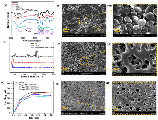 (a) FTIR spectra of VA, AM, core–shell polymer nanoparticles (PDCS), 1000ppmPDCS/SA/VA/AM hydrogel; (b) Raman spectra of VA, core–shell polymer nanoparticles (PDCS) and 1000ppmPDCS/SA/VA/AM hydrogel; (c) swelling of hydrogels; (d,d1) SEM images of core–shell polymer nanoparticles (PDCS); (e,e1) SEM images of 1000ppmPDCS/SA/VA/AM hydrogel; (f,f1) SEM images of 1000ppmPDCS/SA/VA/AM hydrogel.