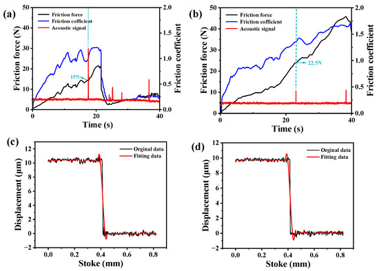 To accurately evaluate the adhesion strength between SA/VA/AM and 1000ppmPDCS/SA/VA/AM hydrogel coatings and Ti6Al4V alloy, adhesion tests were performed using a friction and wear testing machine (UMT) based on the normal force (critical load), acoustic emission signals and friction fluctuations at the time of coating separation. The adhesion test results are shown in Figure 3a,b. The critical load sequence of the sample is as follows: SA/VA/AM (15 N) < 1000ppmPDCS/SA/VA/AM (22.5 N) data analysis showed that due to the addition of PDCS nanoparticles, a large number of hydrogen bonds were formed with the amino groups on the grafted dopamine on the substrate [2,23]. Therefore, the interface bonding strength between the 1000ppmPDCS/SA/VA/AM hydrogel coating and the substrate is improved. Figure 3c,d shows the thickness of SA/VA/AM and 1000ppmPDCS/SA/VA/AM hydrogel coating. The thickness of SA/VA/AM hydrogel coating and 1000ppmPDCS/SA/VA/AM hydrogel coating is very similar, about 15 μm. This shows that the hydrogel coating can be uniformly prepared on the titanium alloy.