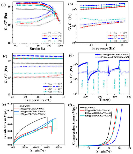Rheological and mechanical properties of hydrogels: (a) strain amplitude scan test at a fixed angular frequency (10 rad/s) at 25 °C (γ = 0.1 ~ 1000%) and the rheological characteristics of every hydrogel: (A): SA/VA/AM; (B): 500ppmPDCS/SA/VA/AM; (C): 1000ppmPDCS/SA/VA/AM; (D): 1250ppmPDCS/SA/VA/AM; (b) Dynamic frequency scanning curve of hydrogel at 10% strain; (c) curve of G’ and G’’ of hydrogel with temperature (25–45 °C); (d) alternate step strain scanning tests from low strain (1%) to subsequent high strain (250%); (e) tensile stress–strain curve of hydrogel; (f) compressive stress–strain curve of hydrogel.