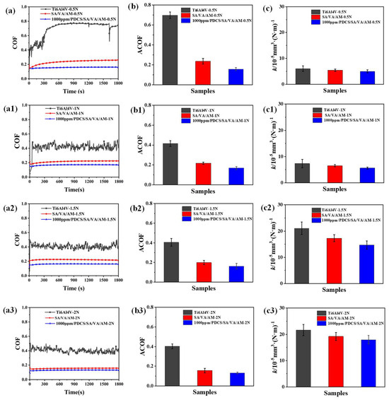 (a–a3) Friction coefficient curves of Ti6Al4V, SA/VA/AM and 1000ppm/PDCS/SA/VA/AM samples under different loads (0.5 N, 1 N, 1,5 N, 2 N); (b–b3) the average friction coefficient (ACOF) of Ti6Al4V, SA/VA/AM and 1000ppm/PDCS/SA/VA/AM hydrogels; (c–c3) friction wear rate of Ti6Al4V, SA/VA/AM and 1000ppm/PDCS/SA/VA/AM hydrogel coatings.