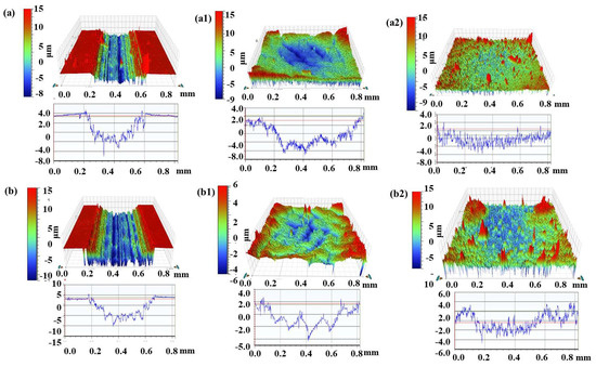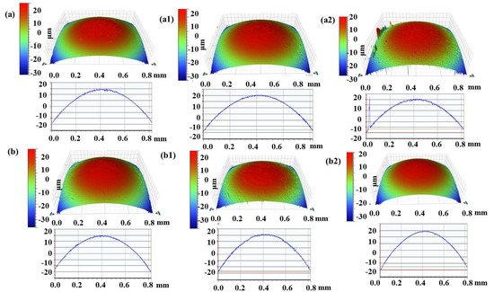 Because the upper friction pair is Si3N4 pellets, the material’s ultra-low surface roughness (G4 class) and ultra-high elastic modulus (300 GPa) tend to show lower wear in friction experiments. As shown in Figure 7a,b and Figure S3a,b, a platform of about 2 μm can be found at the top of the cross-section profile of the silicon nitride pellets, while the corresponding Si3N4 pellets with hydrogel coating can hardly be observed to lose volume. In addition, micron particles are clearly visible in the three-dimensional topography, as shown in Figure 7a,b and Figure S3a,b, which may be from the adhesion of Ti6Al4V alloy chips. However, this phenomenon is not obvious on the samples with the hydrogel coating (Figure 6a1,a2,b1,b2 and Figure S2a1,a2,b1,b2), which is because the Ti6Al4V alloy does not have direct contact with the hydrogel coating. Smaller particles can be observed on the surface of the Si3N4 ball, as can be observed in the Figure 7a2,b1 and Figure S3b,b1,b2, which may come from the adhesive wear of the hydrogel coating. The hydrogel fragments dispersed into the lubricant during the frictional procedure stick to the Si3N4 ball, and this process of shedding and adhesion undoubtedly means greater wear of the coating [46,47]. In Figure 7b2 and Figure S3b1,b2, it is more obvious in high load experiments, which is in line with the findings from the wear rate and friction coefficient.