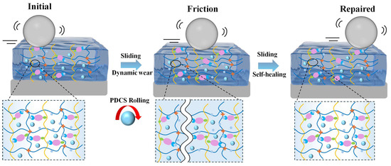 The tribological properties of a polymer surface are related to its network composition and structure, and a weak network can be designed as a sacrifice bond to enhance the toughness of the whole structure [48]. The precursor liquid system with nanoparticle dispersion will affect the entanglement of the polymer chain to achieve the regulatory network structure. Weak interactions such as the hydrogen bond and Schiff base bond can be re-established after being destroyed, and this destruction–repair sequence can achieve a certain degree of dynamic damage repair [49,50]. Under these guiding theories, hydrogels with low friction, low wear and dynamic damage repair function can be designed. During the ball-and-plate friction experiment, the balls with the upper friction pair fixed passed through the surface of the material in the form of point contact one after another. The hydrogel coating constructed with polyacrylamide and sodium alginate as the main structure was more conducive to energy dissipation due to its low elastic modulus (compared with Si3N4) [51,52], as shown in Figure 8. More energy is effectively dissipated during friction operation, which means less direct mechanical damage, which is macroscopic in the form of lower interface wear. The instantaneous friction in the relative frictional motion is related to the adsorption and relative slip of the material surface chains. The aldehyde group and the amino group of polyacrylamides in vanillin molecules can form Schiff base bonds, and this dynamic covalent interaction of moderate strength can be regarded as the fixation of the polyacrylamide chain. In addition, the sodium alginate polysaccharide chain and the polyacrylamide chain will also be entangled due to hydrogen bonds. Therefore, the forced movement of the polyacrylamide chain due to friction is dynamically limited, and the macroperformance is of low-interface friction. There are also spheroidal core–shell polymer nanoparticles (PDCS) that play a ball-bearing role in hydrogel material networks, where the sliding friction between some chains is converted into chain–ball–chain rolling friction, and this conversion of friction types also means a substantial reduction in the coefficient of friction [53].
