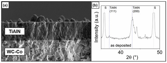 SEM cross-sectional image (a) and XRD diffraction pattern (b) of the as-deposited TiAlN coating (S-substrate).