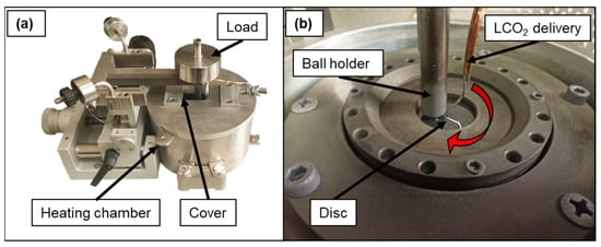 During tests under N2 and CO2 atmospheres, a constant flow of pure gas was blown through the tribometer’s inner chamber throughout the whole measurement. The purity of the applied CO2/LCO2 was ≥99.5%, and the purity of N2 was 5.0. Before the test was performed, the gas was fed into the inner chamber continuously for at least 10 min in the case of room temperature and from the start of heating in the case of elevated temperature experiments. LCO2 was added just before the ball-on-disc test began. When performing the tests in an air atmosphere at room temperature, the room conditions were 25 °C and ≈50% relative humidity (RH, measured with a Voltcraft HT-200 humidity meter). For the LCO2 test, the conditions were the same as for the CO2 test, with the addition of LCO2 delivered directly into the contact zone as shown in Figure 2b. We used the liquid phase, delivered through a capillary with a diameter of 0.4 mm at a flow rate of ≈83 g/min. The LCO2 outflow was positioned perpendicular to the direction of rotation with an angle of 45° relative to the disc close to the ball-coating contact (1–2 mm).