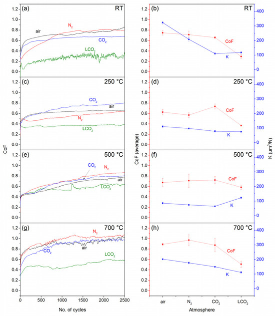 CoF measurements at RT (a), 250 °C (c), 500 °C (e) and 700 °C (g) and average CoF and wear rate at RT (b), 250 °C (d), 500 °C (f) and 700 °C (h), measured in ambient air, N2 and CO2 atmospheres, as well as a CO2 atmosphere with additional LCO2.