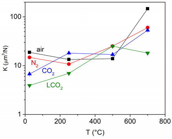 However, when LCO2 is used, the results at elevated temperatures are completely reversed. At 500 °C, the wear is the most intense, while at 250 °C, it is the least intense, which aligns with the CoF trend. At 700 °C, the wear rate, again, slightly drops compared to the values at 500 °C, and the maximum wear-track depth noticeably drops, reaching the lowest values under all testing conditions (0.17 µm), suggesting that counter-body wear increases the width of the wear track on the coating. Therefore, to better understand of coating wear, it is also important to consider the wear behaviour of the counter body. The wear coefficient (K) as a function of temperature is shown in Figure 4. It is obvious that K does not noticeably change up to a temperature of 500 °C, regardless of the atmosphere. At 700 °C, it increases by a factor of ≈10 in ambient air and by a factor of ≈3 in N2 and CO2 atmospheres. This is consistent with findings [28,48,49] that WC-Co hardness decreases at elevated temperatures. In the case of LCO2, K does not change as the temperature rises, which confirms the effectiveness of the cooling effect of LCO2.