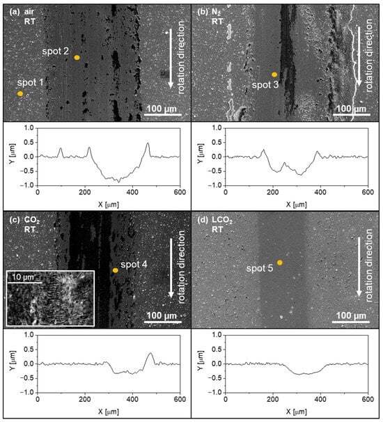 SEM images and profile cross-sections of wear tracks obtained in ambient air (a), N2 (b) and CO2 (c) atmospheres, as well as a CO2 atmosphere with additional LCO2 in the contact zone (d). Tests were performed at room temperature. Fish scale-like debris is present in the centre of the wear track in the CO2 atmosphere (see inset, (c)).