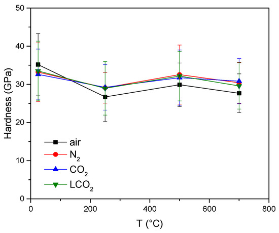 Nanohardness of the undisturbed coating at room temperature, 250 °C, 500 °C and 700 °C in various atmospheres.