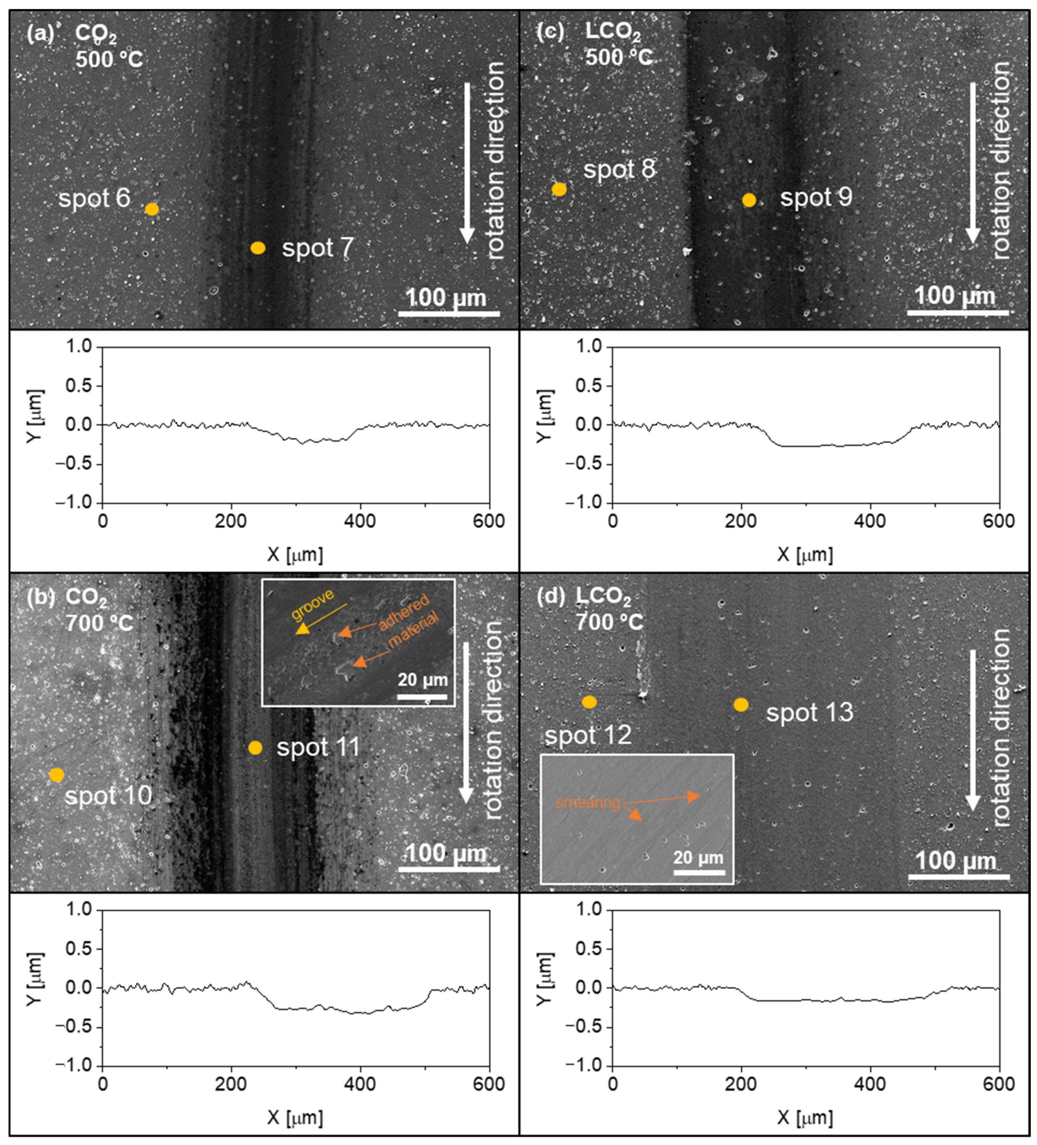 SEM images and profile cross-sections of wear tracks obtained in a CO2 atmosphere at 500 °C (a) and 700 °C (b) and with additional LCO2 in the contact zone at 500 °C (c) and 700 °C (d).