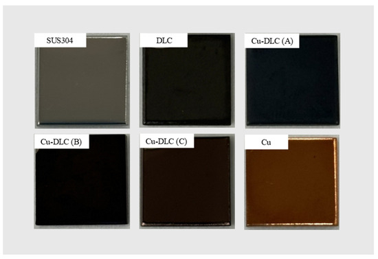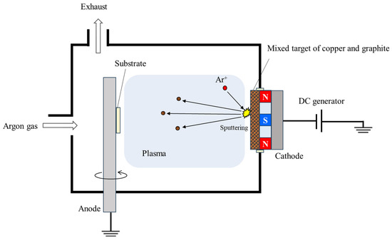 Three types of target materials (Toshima Seisakusho, Saitama, Japan) with different C/Cu ratios were developed to adjust the Cu content of the Cu-DLC film. The mixed targets were manufactured by mixing C and Cu powders in ratios of 30%, 40%, and 50% Cu, followed by sintering. The higher the C concentration, the higher the sintering temperature, but if the C concentration in the target exceeds 70%, the sintering temperature exceeds the melting point of Cu, which then melts. Therefore, the lower limit of the Cu concentration in the C/Cu mixed target was set to 30% to prevent Cu from melting. Cu-DLC films were prepared on SUS304 substrates via magnetron sputtering (NPS-330, Nanotec, Chiba, Japan) with Ar gas, employing three types of mixed target materials. The Cu-DLC films were labeled Cu-DLC (A), Cu-DLC (B), and Cu-DLC (C) in the order of the Cu ratio in the C/Cu mixed target (30%, 40%, and 50%, respectively). In addition, DLC and Cu films were produced using C and Cu targets, respectively, for comparison with the Cu-DLC films.