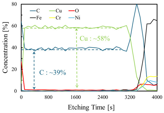 Figure 3 shows the XPS depth profile of Cu-DLC (C). The profile represents the depth information of the Cu-DLC film as the etching time increases. When the etching time reaches approximately 3200 s, Fe, Cr, and Ni are detected, suggesting that the etching has reached the substrate. Focusing on the Cu content in the depth direction of the Cu-DLC film, approximately 58 at% Cu was continuously present in the Cu-DLC film in the area except near the Cu-DLC top surface and the substrate interface. This continuity in the depth direction of the Cu film suggests that the elements in the Cu/C mixed target are mixed to a certain extent. The amount of Cu in the Cu-DLC film compared to that in the target is strongly influenced by the element-specific sputtering rate. When using a Cu/C mixed target to produce Cu-DLC films, as in this study, the Cu content in the Cu/C mixed target should be lower than the desired content. The amount of Cu estimated by XPS is slightly higher than the amount of Cu detected by EPMA. It was confirmed that the Cu content on the Cu-DLC surface exposed to molecular oxygen is clearly lower than that in the interior of the film, owing to the more advanced oxidation of the surface. Because the amount of Cu detected by EPMA is an average over the entire film, it seems reasonable that the amount of Cu estimated by the XPS depth profile would be slightly higher.
