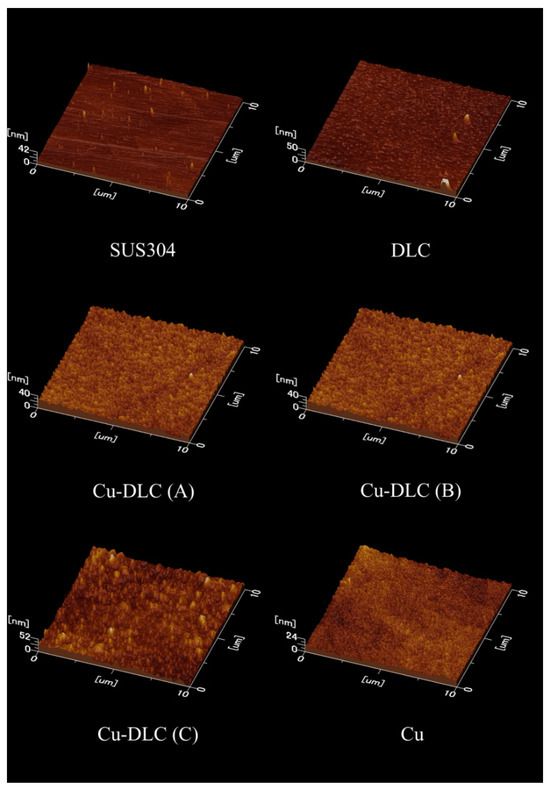 Table 3 lists the surface composition, surface roughness, and dynamic friction coefficient of each sample, as determined by XPS. The C 1s and Cu 2p spectra of each sample are shown in Figure 5, AFM images are shown in Figure 6, and the results of the ball-on-disk test are shown in Figure 7.