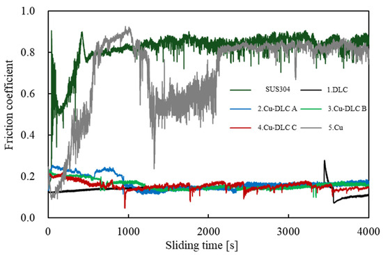 The dynamic friction coefficient of each sample is expressed as the average value ± standard deviation when the ball-on-disk test is performed for 4000 s. The dynamic friction coefficient of the base material SUS304 was 0.82 ± 0.10, and all the Cu-DLC samples maintained good sliding properties equivalent to that of DLC. When comparing these Cu-DLC samples, the measurement variation was within the acceptable range, and no significant difference was observed in the Cu concentration range (~40.0–54.1 at%) of the Cu-DLC. The sliding properties of Cu-DLC may be affected by the film thickness and the base substrate material, in addition to the amount of Cu in the film; therefore, further investigations are planned [21].