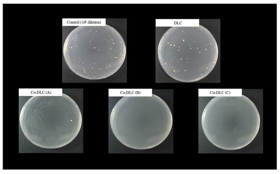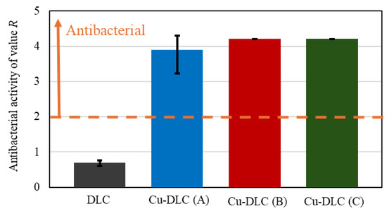 Figure 8 and Figure 9 show the antibacterial activities of the Cu-DLC films. Figure 8 presents the antibacterial activity values of the DLC samples against Staphylococcus aureus; DLC, Cu-DLC (A), Cu-DLC (B), and Cu-DLC (C) are 0.7 ± 0.02, 3.9 ± 0.50, 4.2 ± 0.00, and 4.2 ± 0.00, respectively, proving that all the Cu-DLC samples produced in this experiment have strong antibacterial properties (R ≥ 2). Figure 9 shows a photograph of the bacteria collected from each sample after being transferred to a Petri dish (Φ = 90 mm). Bacteria (white spots) were observed in the DLC and control samples. The antibacterial effect of Cu-DLC is supported by the observed activity of Cu-DLC produced using other deposition processes [7,10,13]. The Cu present on the surface and inside the Cu-DLC film is released from the film as Cu ions, and the growth of bacteria is inhibited by the reactions of these Cu ions [7]. Ohta et al. found that even Cu-DLC with a very low Cu content (0.3 at%) exhibits antibacterial effects, and that complete sterilization is possible when the Cu content is ≥10 at%. Thus, it is reasonable to assume that Cu-DLCs with a relatively high Cu concentration, as produced in this study, will have good antibacterial properties.