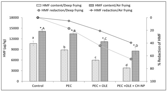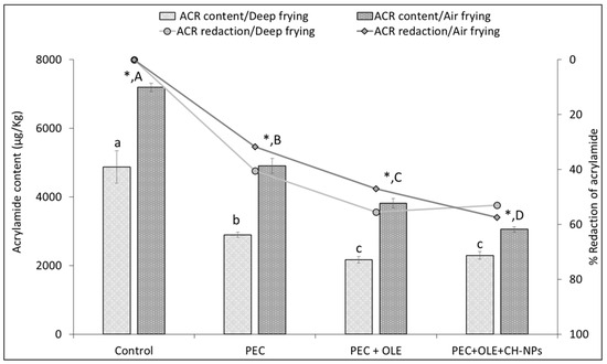 The formation of ACR and HMF during frying is shown in Figure 1 and Figure 2, respectively. The results revealed that hot air frying produced significantly higher levels of ACR compared to deep fat frying, regardless of whether the French fries were coated with a PEC-based solution or not, and whether OLE or CH-NPs were added.