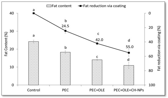 Oil absorption in fried foods occurs through three mechanisms: (1) the water replacement mechanism, where escaping water creates pores for oil to enter [50]; (2) the condensation effect, where oil is drawn into pores as pressure drops after frying [51]; and (3) prolonged frying, which reduces interfacial tension due to oil hydrolysis, allowing easier oil penetration [50,52]. The coating method was recently used due to its significant contribution to controlling the oil absorption during frying, due to its capability to cover the product surface of the potato strips during dipping. The effect of different PEC-based coating solutions containing OLE with or without CH-NPs on fat content was evaluated and the obtained results are shown in Figure 3. The obtained results indicated a significant reduction in oil uptake through all coating solutions that were used compared to the control sample. The highest oil uptake was detected in the control sample, which was around 23%, while the lowest value was obtained after the French fries were coated with PEC containing OLE + CH-NPs, with an oil uptake of 11%. These results were in agreement with previous data, where the conclusion was that using the oil content of French fries coated by PEC 1% was 14% and the PEC was able to reduce the oil content by 29% compared to the control sample [19]. Moreover, Kizito et al. [53] studied the effect of different hydrocolloid materials on the oil uptake of potato strips, and they found that PEC achieved the most significant oil reduction of 12.93%, compared to the carboxymethylcellulose 11.71%, chitosan 8.28% and agar 5.25% at the same experimental conditions. The obtained results indicated that by using a PEC-based coating solution, and PEC in the presence of OLE or OLE + CH-NPs, the oil content was reduced to 24.5, 42, and 55%, respectively. Recently, Yang et al. [51], concluded that by coating the French fries with sodium alginate, the oil content was reduced by 52.5%. The ability of hydrocolloid-based coatings to minimize excessive oil absorption can be attributed to their capacity to lower the heat transfer coefficient, as thoroughly explored in the review by Kurek et al. [54]. The result indicated that OLE with or without CH-NPs is able to enhance the capability of the PEC coating solution to be less permeable to oil, which helps to produce healthy French fries products.