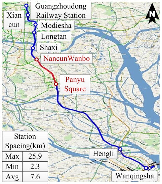 This study uses the tunneling data from line 18 of Guangzhou Metro, which is located on the coast of the Pearl River Delta of Guangdong, China. Line 18 starts from Wangqingsha Station in Nansha District to Guangzhou Dong Railway Station in Tianhe District. The total length is 61.3 km. It was designed to have nine stations with an average distance of 7.6 km between two adjacent stations. The maximum distance between the two stations is 25.9 km, while the minimum is 2.3 km, as shown in Figure 1.