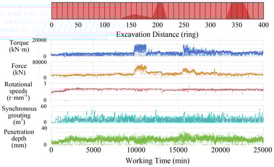The field data are acquired from the monitors in the TBM every minute. These data specifically include thrust force (TF), cutter head torque (CT), penetration depth (PD), cutter head rotation speed (CRS), etc. The TBM field monitors categorize the working states into “Excavation”, “Segments”, and “Shutdown” when collecting data. For this study, data from the two tunnels were collected for more than 50,000 min in the “Excavation” states, encompassing a total of 263 features, and Figure 3 shows some of the shield operation parameters concatenated in series under this state. The geological exploration, operational data collection, and cutter structure constitute the three main aspects that affect the extent of cutter wear [18,30,31]: (1) the geological conditions (e.g., UCS, CAI); (2) real-time TBM performance parameters (e.g., CT, PD, CRS); and (3) cutter structure (e.g., dimensions and placing).