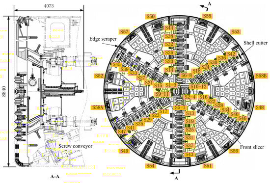 This structure is the same in the TBM of the right metro line and the left metro line. Each cutter head contains 59 cutters in two sizes. S1–S12 cutters are 17 inches, and the other S13–S58AB cutters are 19 inches. Figure 4 shows a schematic section of the cutter head and disc cutter arrangements of the shield. The TBM has a length of 12.94 m, and the cutter head has a diameter of 8.84 m.