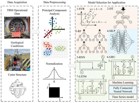 In the TBM tunneling process, the disc rolling cutters make contact with the rock and penetrate the rock continuously until the rock slabs. In this process, the cutters will inevitably be worn [4,5]. When a worn disc reaches its threshold and is not replaced in time, the surrounding cutters will be worn quickly. Furthermore, the failure of seals and bearings may occur which results in damage to the cutter head [6]. If the TBM continues to excavate, some risks may occur including project delay, TBM stoppage, equipment damage, etc. [7]. Excessively frequent shutdowns for maintenance can increase economic and time costs, while excessively long tool-changing distances can reduce the efficiency of shield tunneling [8]. As pointed out by Wang et al. [9] and Wan et al. [10], nearly one-third of the project cost and construction time are occupied by the maintenance and replacement of disc cutters in TBMs. Therefore, accurately identifying and predicting the wear condition of disc cutters at different tunneling stages is of great significance for reducing the number of cutter changes, shortening the tunneling duration, and lowering construction risks and costs. Existing reports demonstrate that intelligent models have already been embedded in TBM control systems. For example, Wei et al. [11] employed a GA-BP model to predict real-time excavation speed, while Lin et al. [12] and Armaghani et al. [13] developed systems based on GRU and PSO-ANN models, respectively, to forecast TBM cutter head torque and penetration rate in real time, thereby informing engineering decisions. Nevertheless, manual inspection and expert judgment remain the principal means of disc cutter management, and current approaches to predicting cutter wear can be broadly classified into empirical models and soft computing models.
