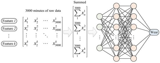 Among the aforementioned 7 models, constrained by their structures, the input forms of data can be categorized into two major types. The first type includes machine learning and fully connected neural networks, in which input data are relatively discrete and need to be represented as a set of feature vectors. The second type is the time series model. Compared with the input of the first category of models, this type of model adds the time information of the input data. In actual excavation, the shield tunneling process is a continuous operation, and the wear of the disc cutter is continuously generated as the TBM advances. Therefore, for the first model type, the disc cutter wear data needs to be summed and averaged before being used as input. Below, take the input of MLP as an example: a disc cutter experiences a shield excavation at a distance of 50 rings (assuming 3000 min) under the action of [Feature 1, Feature 2, Feature 3, …, Feature k] (each feature is collected at a frequency of once per min), and its wear increases from 10 mm to 14 mm. Therefore, before inputting, it should sum and average the 3000 data points, and the corresponding Y label is 4 mm, as shown in Figure 6.