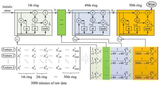 Such a processing method may be undesirable because it will ignore the data of certain special cases in the continuous signal. In comparison, time series models can better reflect the actual tunneling and disc cutter wear processes. This study employs three time series models, the RNN, LSTM, and GRU, respectively. Among them, the RNN is the basic recurrent neural network architecture [32]; LSTM solves the gradient vanishing problem of the RNN by introducing the input gate, forget gate, output gate, and cell state. It has long-term memory ability and is suitable for processing long sequence data, but the computational complexity is high [33]. GRU merges the forget gate and input gate of LSTM into an update gate, sets up a reset gate, removes the cell state, simplifies the model structure, and reduces the computational complexity [34,35]. Hyperparameters are critical prerequisites that determine model performance. In this work, we focus on evaluating the interaction between different preprocessing methods and models; accordingly, all time series models were configured with a single hidden layer and the tanh activation function. For each model, four settings of hidden layer node numbers (64, 128, 258, and 512) were explored. Combined with the data characteristics of this project, with GRU as an example, the format of the input data for the time series models is shown in Figure 7.