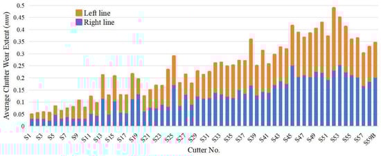 By organizing the information about cutter wear in both the right and left lines, we have compiled a total of 886 wear measurement records. Among these, there are only a few instances of abnormal cutter wear, specifically 26 records. Among the 26 abnormal wear records, nearly 20 involve the double-edged disc cutters installed around the center of the cutter head. Owing to their small gyration radius, these cutters undergo both sliding and rolling motions and are subjected to large axial forces, which leads to uneven wear of the cutter rings. Because wear measurement can only be taken manually when the TBM shuts down, it is impossible to determine the exact moment or precise position at which the abnormal wear occurs. To avoid the imbalance between normal and abnormal wear records from interfering with subsequent model training, we have excluded these data points from further analysis.