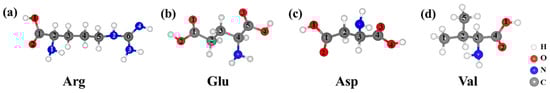 Optimized molecular configurations of (a) Arg, (b) Glu, (c) Asp, and (d) Val.