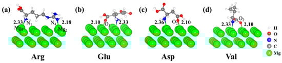 Following optimization calculations, the adsorption configurations of four amino acid molecules on the Mg(0001) surfaces were determined to reach their lowest energy states. The optimized adsorption configurations of Arg, Glu, Asp, and Val on the Mg(0001) surfaces are presented in Figure 2. Notable differences in the adsorption sites and modes were observed for the various amino acids. Specifically, Arg interacted strongly with the Mg surface through its amino and guanidino groups, whereas Glu, Asp, and Val formed bonds with the Mg surfaces primarily through their amino and carboxyl groups. The Eads, calculated using Equation (1), are shown in Table 1. The calculated Eads values, ranked by descending absolute magnitude, were as follows: Arg (−1.67 eV) > Glu (−1.31 eV) > Asp (−1.23 eV) > Val (−1.16 eV). These results indicate that Arg exhibited the strongest Eads on the Mg(0001) surface, suggesting that its adsorption behavior was the most stable among the four amino acids studied.